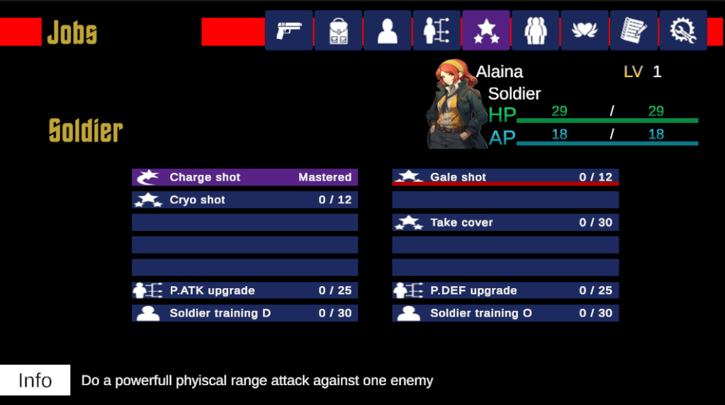 The dungeons randomize and there are special floors that stay the same for cutscene /story beat reasons. There was a daytime system that would change the postprocessing effect depending on the time of day (morning, afternoon, evening, and night). Time would move forward only when the player chooses an activity to do (like hanging out with a crew member, building a new part for the ship, or going into the dungeon). There was a persona 4 personality system that could be leveled up. This personality system would allow you to switch jobs in the later game. There was a job system that played like Final Fantasy X-2 where you unlock skills the more battles you won. In total there were 21 job classes, you only got to choose between starter classes (Solder, Assistant, Mechanic) at the start of the game. Each job had about 12 skills, everything from active damage skills to passive buff against enemy types.